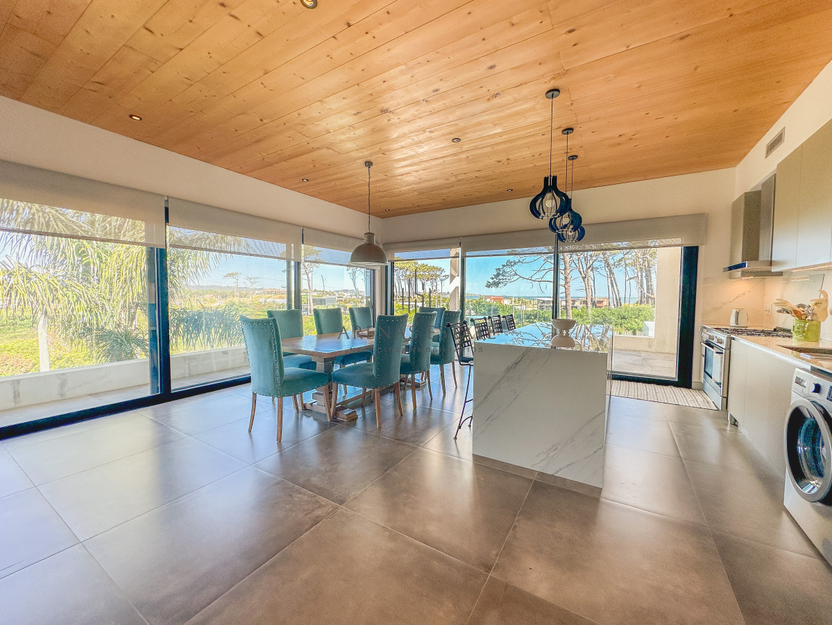Hermosa casa de estilo moderno a 200 metros de la playa. Desarrollada en dos niveles, planta alta con gran living-comedor, cocina integrada con isla y terraza con parrillero. Vista al mar, pudiendo llegar a verse Punta Ballena y Casa Pueblo. En planta baja, 3 dormitorios (principal en suite con vestidor) y 2 baños completos. Cochera techada. Amplio parque. Aire acondicionado central. Alarma. Se alquila con sábanas y toallas. Capacidad para 7 personas (3 camas dobles y 1 simple).